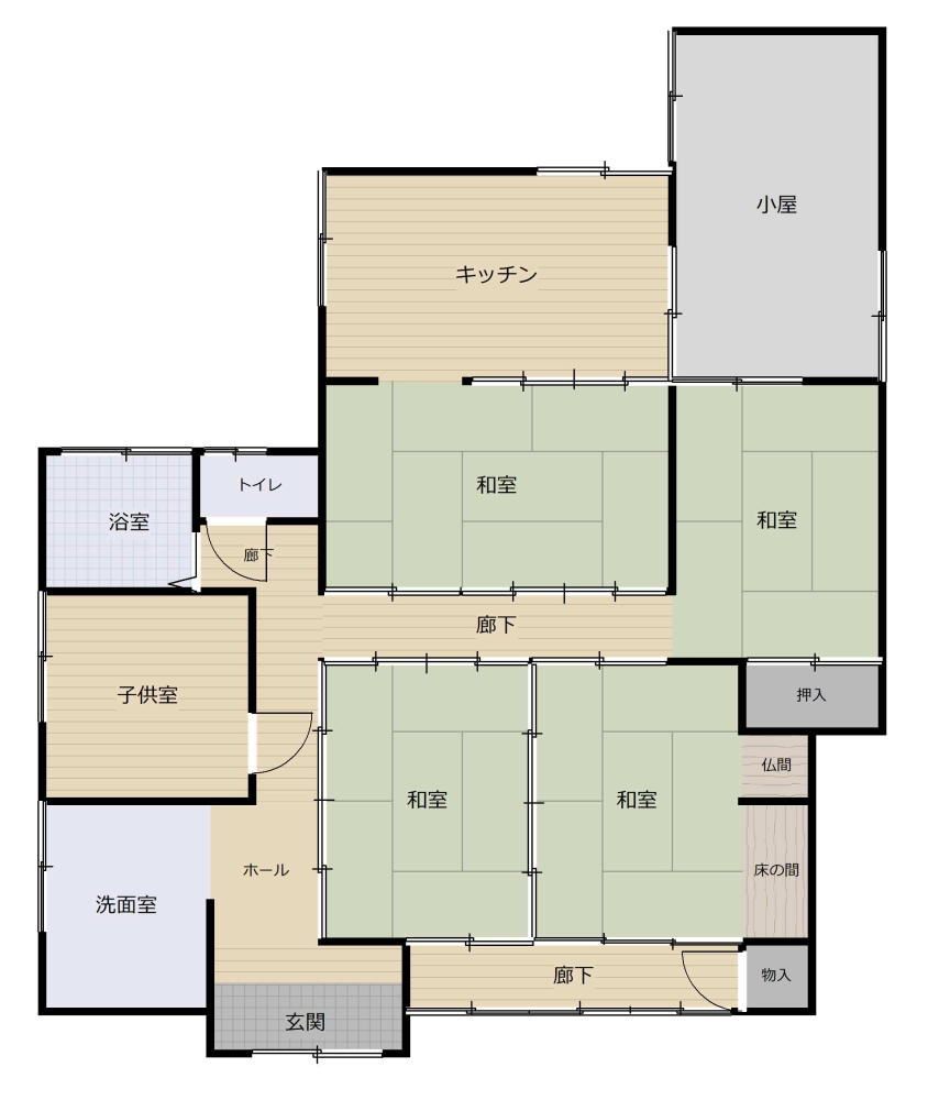 | 建物面積 | 95.99㎡(28.93坪) 木造セメント瓦葺平家建(未登記増築20㎡ほど) |